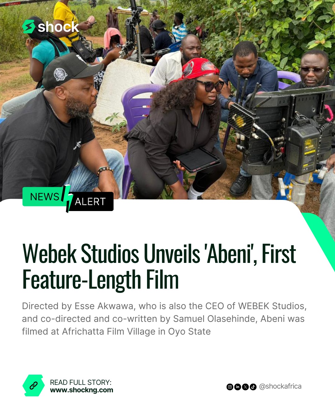 NEW: ‘Abeni’ marks a milestone as Webek Studios’ first feature-length film, helmed by director @esserocks and co-director/co-writer @officialsamuelajirebi From day shoots to night scenes, every frame was crafted with purpose at Africhatta Film Village, Oyo State Learn more about the title + plot details on shockng.com Follow @shockafrica for latest industry updates like this.